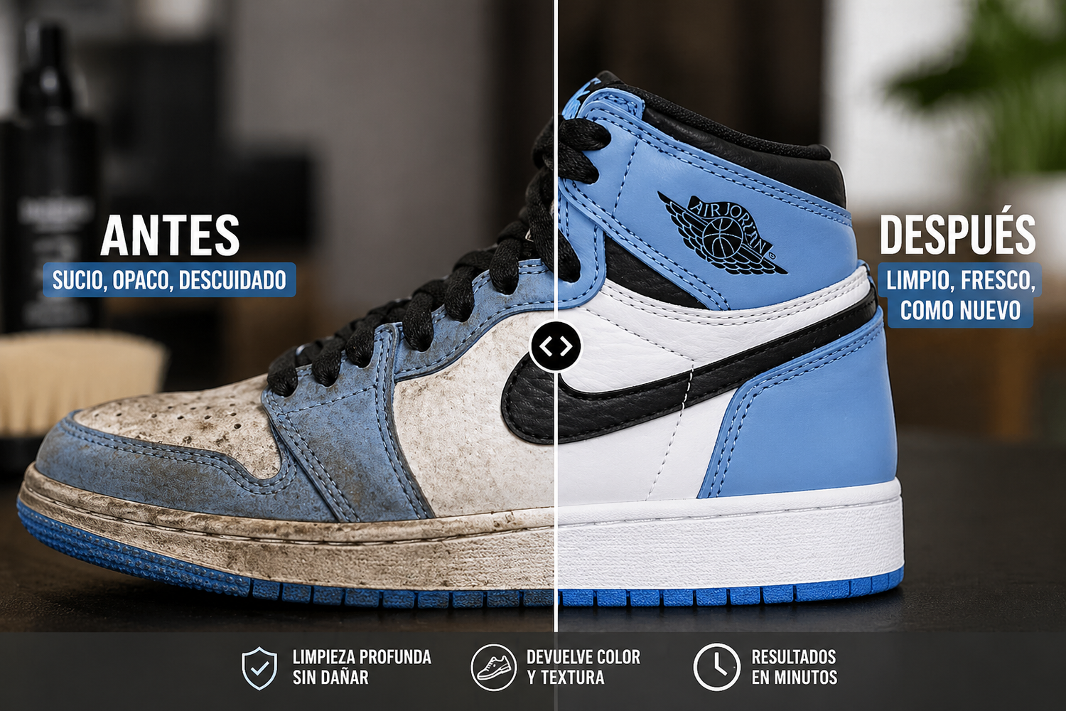 nuestra formula avanzada penetra las fibras mas delicadas para restaurar y recuperar el brillo y la textura de tus tenis.